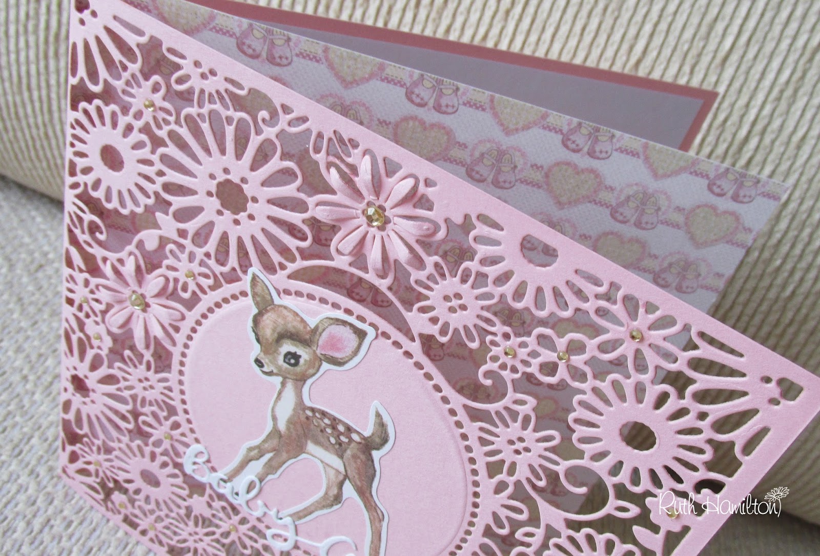 7. Die cut the heart bunting twice, cut in two so that there are 3 hearts on each and glue to the bottom flaps of the card with a lilac pearl in each heart.